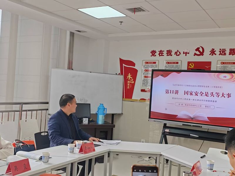 为深入贯彻落实习近平总书记关于学校思想政治理论课建设的重要指示精神,扎实推进芜湖市大中小学思政课一体化共同体建设,4月10日,我校举行芜湖市大中小学思政课一体化共同体建设集体备课会。芜湖市龙湖中心小学校长章如兴,芜湖第一中学思政教师吴霞,芜湖市第二中学“道德与法治”教师陈春辉,马克思主义学院马克思主义学院教学副院长刘德军、党总支委员虞满华、思政课教师杨孝旭参加会议。会议由刘德军主持。