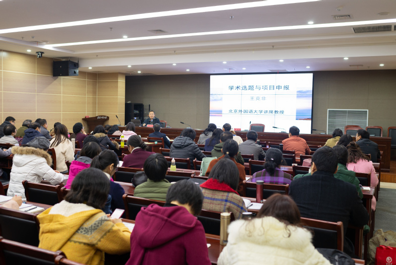 12月11日下午,在图书馆202会议室,知名学者、北京外国语大学王克非教授应邀来我校做了“翻译研究拓展的取向”和“学术选题与项目申报”两场学术报告。报告会由外国语学院院长黄焰结主持,科技处处长吴之传、外国语学院全体教师与研究生以及其他学院的部分老师参加了学术报告会。副校长费为银出席报告会,他对王克非教授长期以来对我校的学术支持表示了感谢,同时高屋建瓴地对外语教师与外语学科的发展提出了要求与方向。