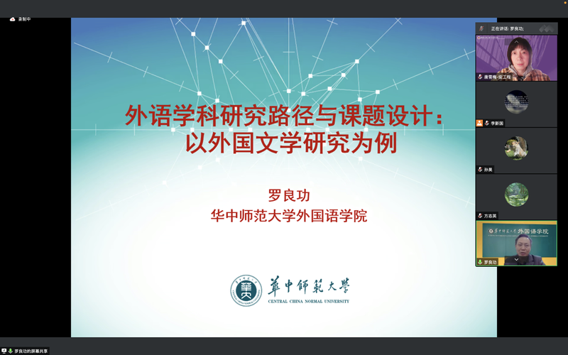 12月13日下午,华中师范大学外国语学院院长、博士生导师、教育部高等学校英语类专业教学指导委员会委员、(中国)中外语言文化比较学会世界族裔文学专业委员会会长罗良功教授应邀为外国语学院做题为《外语学科的研究路径与课题设计--以外国文学研究为例》的学术报告。报告在腾讯会议线上举行,学院各科研团队教师、拟申报2023年度国家社科基金的教师和部分研究生参加了报告会,会议由外国语学院副院长唐雪梅教授主持。