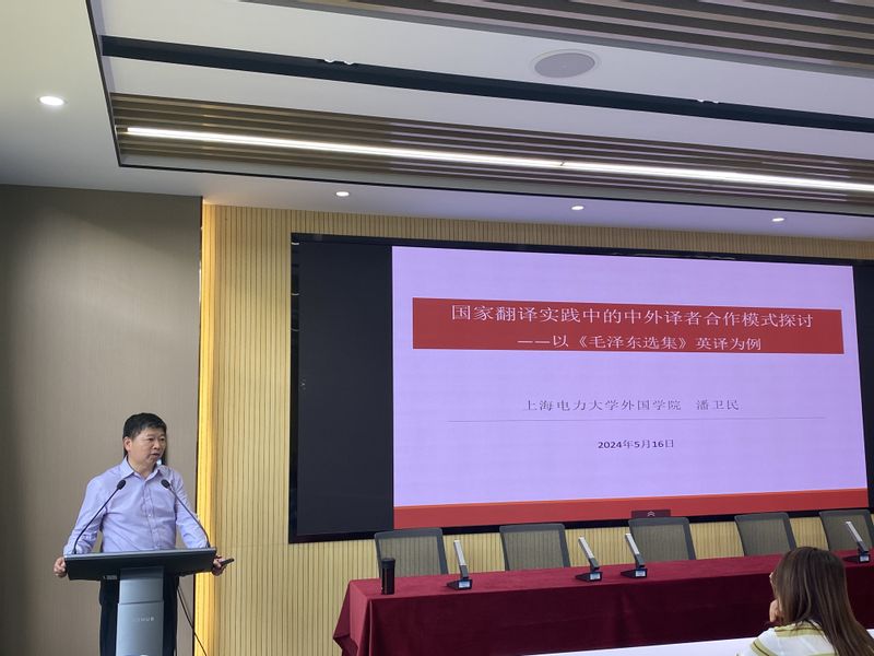 报告会上,潘卫民作了题为“国家翻译实践中的中外译者合作模式探讨——以《毛泽东选集》英译为例”的学术报告。潘教授指出了国家翻译实践的实质,理清了参与国家翻译活动的译员构成及他们作为制度化译者的角色定位,并以《毛泽东文选》英译本的不同版本及相关改进方针为例,分析了《毛泽东文选》在翻译实践各阶段的不同特征和采取的不同宣传策略,探讨了《毛泽东选集》的译者群体如何形成有组织、体系化的集体。潘教授特别提出在国家翻译实践中,译者不仅要具备深厚的翻译功底,更要有良好的政治素养,传承好中华传统优秀文化,在翻译实践中体现文化自信,为当今翻译实践提供有价值的借鉴经验。