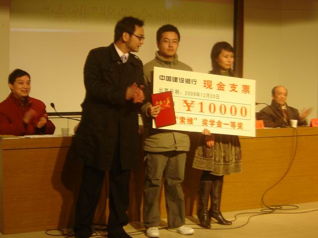 12月20下午4:30,2009年机械工程系“索维”奖学金颁奖典礼在学术报告厅隆重举行。上海索维机电设备公司副总经理朱振宇、上海索维集团行政部经理李燕、机械工程系副主任许德章及项宁、何芝仙、黄炜等老师出席了典礼,典礼由系党总支副书记邓英扣主持。
